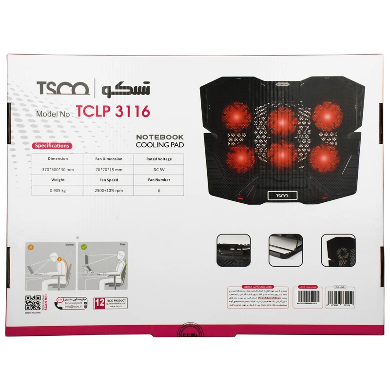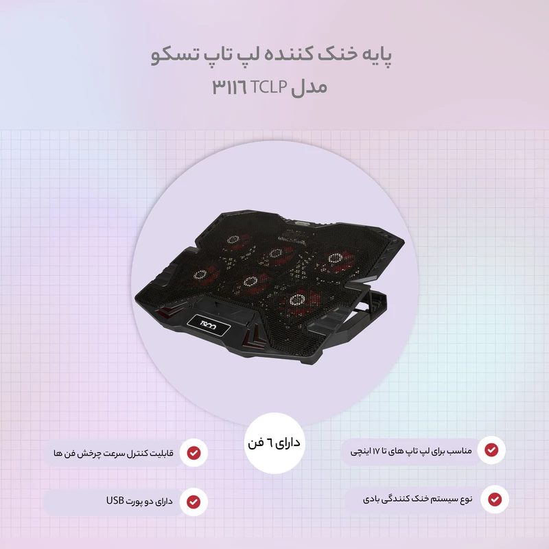 معرفی : کاربرانی که استفاده مداوم و زیادی از لپتاپهای خود دارند؛ معمولاً از وسایل جانبی متعددی استفاده میکنند تا سرعت و کیفیت کارشان بالا برود. معمولاً لپتاپها در اثر استفاده بیش از حد اصطلاحاً داغ میکنند و فن آنها برای خنکسازی سیستمهای درونی همچون موتور تراکتور شروع به کار میکند و صدای عجیبی از آنها بلند میشود. زمانی که دمای درونی لپتاپ متعادل باشد سرعت اجرا و عملکرد برنامههای لپتاپ نیز به خوبی پیش میرود. به همین دلیل کاربران پرمصرف بایستی از وسایلی برای خنکسازی لپتاپ خود استفاده کنند تا مجبور به خرید زودهنگام و مجدد لپتاپ جدیدی نشوند. پایه خنک کننده لپتاپ تسکو مدل TCLP 3116 یکی از دستگاههای بسیار کاربردی برای افرادی مانند گیمرهاست که استفاده زیادی از لپتاپ خود دارند. این مدل مناسب برای لپتاپهای تا 17 اینچی است و پایه آن جهت تنظیم ارتفاع قابلیت تغییر دارد. این مدل از خنک کننده دارای 6 فن و سیستم خنککنندگی بادی است که شما میتوانید سرعت چرخش فنها را کنترل کنید. همچنین مدل TCLP 3116 دارای دو پورت USB است.